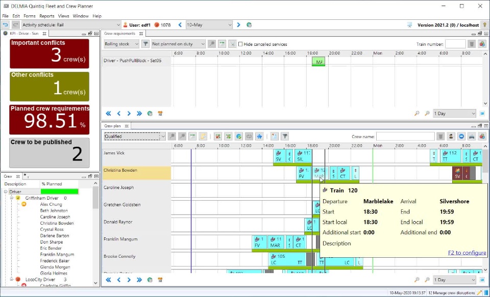 During day-of-operations a lot can happen that disrupts the original plan of a train operating company. Tasks may need to be reassigned and as time does not stop running, it is important to quickly find new crew to take over a particular task. Having good visibility in the system who is available, who has the route and traction knowledge required, and to who it could be assigned without violating labor rules such as maximum working and driving time is key to making the best decision in assigning the task to a new driver, leaving valuable time to focus on resolving other disruptions as well. Below video shows how DQ Fleet & Crew Planner supports the crew dispatcher in quickly finding suitable crew for a task.