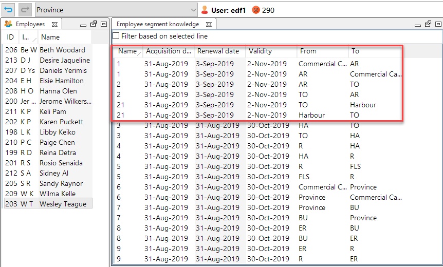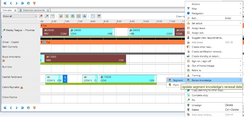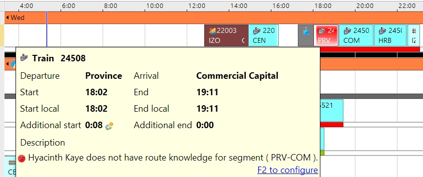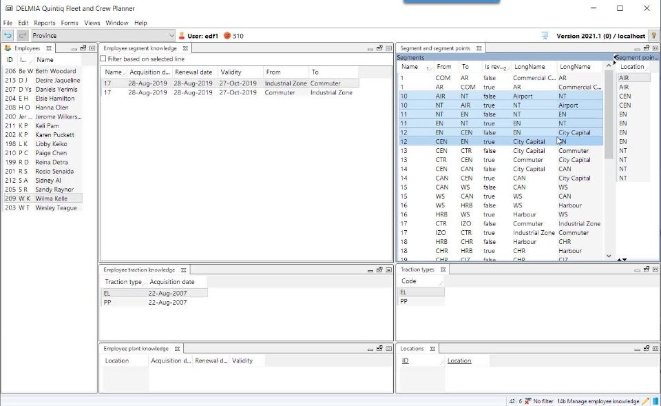 Route knowledge is an important factor to take into account when assigning train-driving tasks to train drivers. DQ Fleet & Crew Planner provides support to maintain and update the drivers' route knowledge as well as to check for valid route knowledge of the driver assigned to a train-driving task. This support ensures a valid crew driver plan can be created meeting the necessary safety requirements concerning the route knowledge the drivers possess. Below example shows a warning given when the assigned driver does not possess the required route knowledge.If the driver in question does posses the required route knowledge, it can be a matter of just updating the route knowledge of the driver. Below video shows in which view route knowledge can be maintained, and how the acquisition date of the segments of which knowledge is acquired can be set.