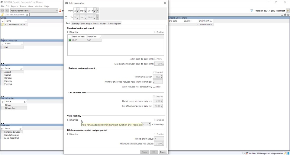 When creating a crew plan it’s important that as a planner you can check whether it adheres to the labor rules. Sometimes different values for the same labor rule apply to crew based at the same location, e.g. due to different labor union agreements or specific agreements with certain employees.