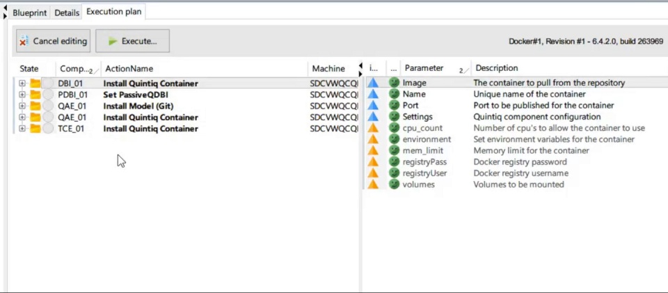 This execution plans shows the steps that QEM will execute to deploy the blueprint. For each step, the parameters are displayed and can be modified if required. Once the execution has been reviewed, the user can proceed with the actual deployment by pressing "Execute…".