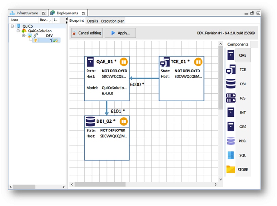 A blueprint is created and maintained by using simple drag and drop actions. Double clicking on a component shows relevant properties of the component. Once the blueprint is complete and ready for deployment, QEM will generate an execution plan as shown in the screenshot below: