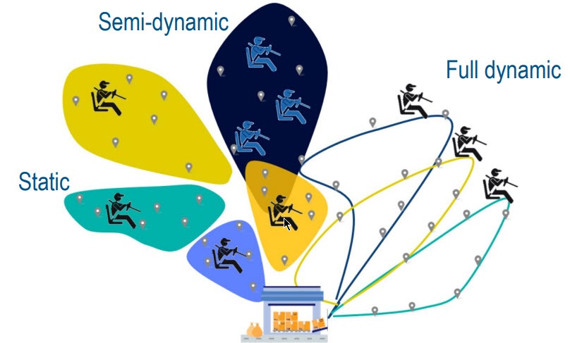 Dynamic routes allow more flexibility and options as routes are not bounded by areas and allows routes to be dynamic based on the balance between productivity and cost which increases the planning complexity especially when taking into account all the business requirements such as delivery windows, delivery types(temperature controlled goods, dry goods etc.) and the available resources and dispatchers.