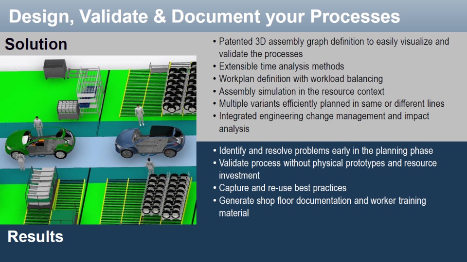 DELMIA’s comprehensive Process Planning solution enables you to “Design, Validate and Document your Processes”.