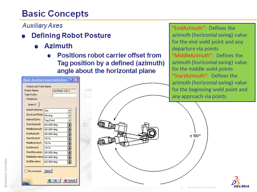 Azimuth is basically the swing value of axes one (Azimuth defines the rotation of robot base about its’ z-axis). Put another way, it will result in an X offset of the base of the robot with respect to the target TCP (at each tag point). When defining auxiliary axes for a single track axis, this is the only Primitive system variable necessary.
