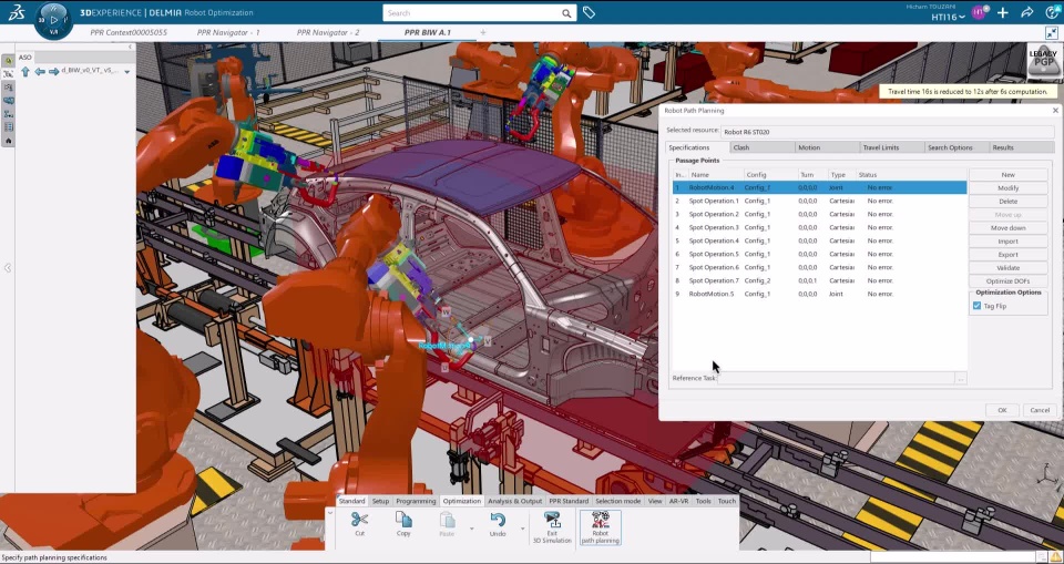 The video shows a step-by-step scenario where the initial Robot Task presents many collisions and configuration changes. Thanks to the "Path Path Planning" feature, the new calculated robot task solution removes unnecessary robot configuration changes. It adds via-points to avoid collisions even in a constrained environment (last robot spot operation).