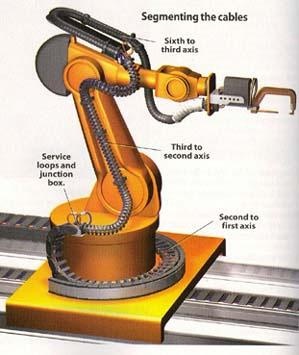 ** In case of six-axis robots, cable design can be divided into three separate segments: the sixth to third axis; the third to second axis; and the second to first axis.