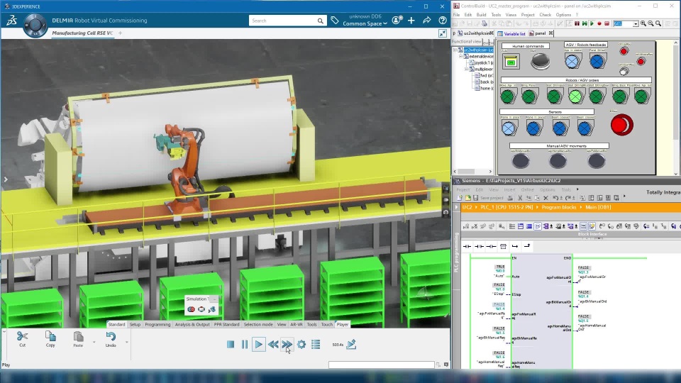 - Step3: Siemens PLC SimAdvanced (VirtualPLC), connected to ControlBuild and DELMIA