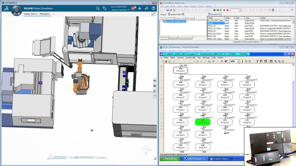 In this demo, we transferred the PLC code from ControlBuild to a Siemens PLC: the PLC pilots the robots as if the real one is connected. As Delmia can execute the real sequences of robots, we get a realistic environment. By this way, the control software engineers can perform a virtual commissioning in very good conditions, and after, realize the real commissioning on the physical plant with a high level of confidence.