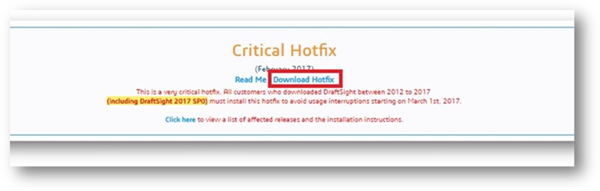 - Please note that installing the Hotfix does not require the installation/update of the DraftSight version, and the installation of the Hotfix does not impact the Licensing of the product. For additional clarification, the correct download link in the page as shown below: