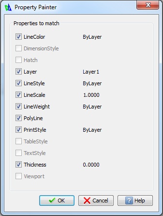 Selecting these options applies the properties of the source entity to destination entities of the applicable type. For example, if the source entity is Text, the TextStyle is applied to all Text entities in the selected destination entities.