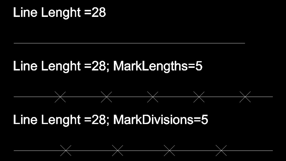 As you can see, MarkDivisions divides the entity selected in equal parts, being the value you provide, the number of parts you want the entity to be divided in. On the MarkLengths case, the number you provide corresponds to the distance between divisions, what usually results in one of the segments/divisions being smaller/larger at the end ( in the example above, 5 segments are 5units apart from each other, but the distance from the last point to the end of the entity/line is 3 units.