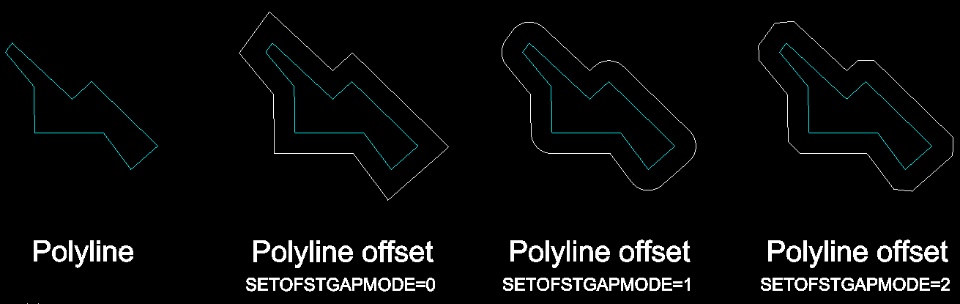 Intrigued? See below an example of a polyline offset, with the different values of SETOFSTGAPMODE: