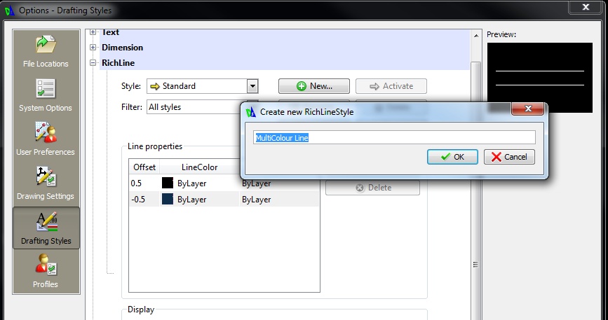 - In your command line, Type RICHLINESTYLE (or from the Menu, go to Tools> Options. Click the Drafting Styles tab, and expand the node RichLine).