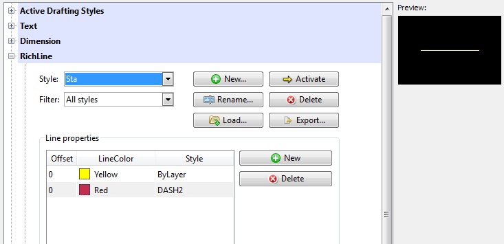 In this method, we’re going to use RichLines. RichLine entities consist of two or more parallel linear constructions created as one object. Before using RichLine entities, you can create custom RichLineStyles to specify the LineColor, LineStyle and other entity properties. But before starting there, make sure you have available in your drawing the line styles you want to use. You can load line styles by typing in your command line LineStyle, and hit enter. The LineStyle dialog will appear: