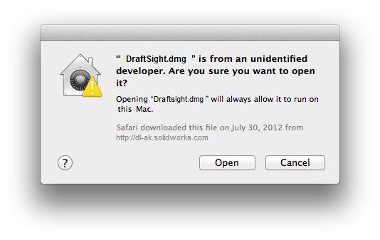 Mac Users might come across this message or a very similar "This App can't be opened because it was not downloaded from the Mac App Store", when trying to install DraftSight.
