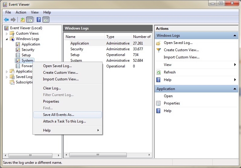 Right click on ‘System’ and choose ‘Save All Events As...’