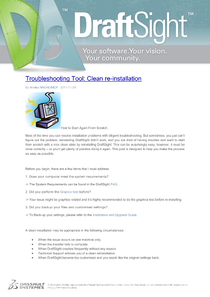 Most of the time you can resolve installation problems with diligent troubleshooting. But sometimes, you just can’t figure out the problem, reinstalling DraftSight didn’t work, and you are tired of having troubles and want to start from scratch with a nice clean slate by reinstalling DraftSight. This can be surprisingly easy, however, it must be done correctly – or you’ll get plenty of practice doing it again. This post is designed to help you make the process as easy as possible.