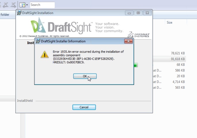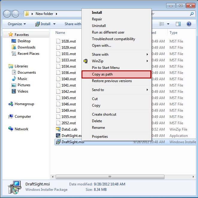 - While holding the Shift key, right-mouse click on DraftSight.msi and select, Copy as path as shown below: