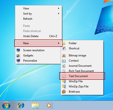 - Create a new text document on your desktop by right-mouse clicking on your desktop and selecting New > Text Document as shown below: