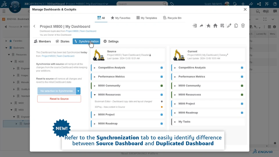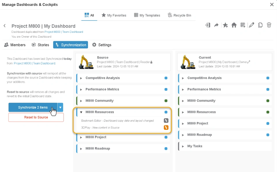 - Synchronize with Source: You can refer to the comparison view and synch specific tab or widget from the source dashboard.