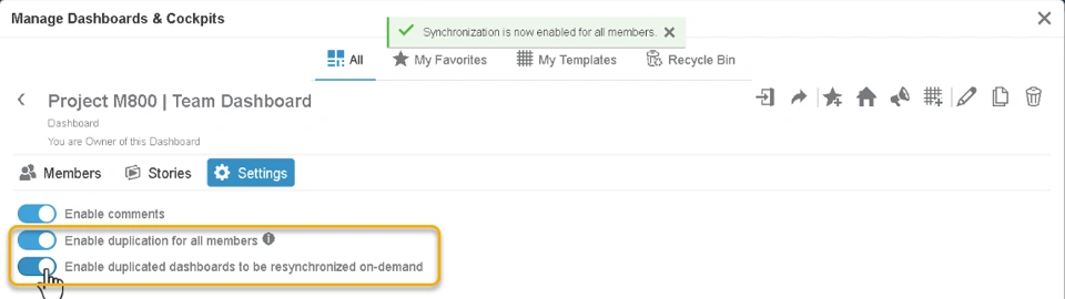 Refer to the following video, which explains how team members can leverage the synchronization feature to synchronize their duplicated dashboard with the source dashboard: