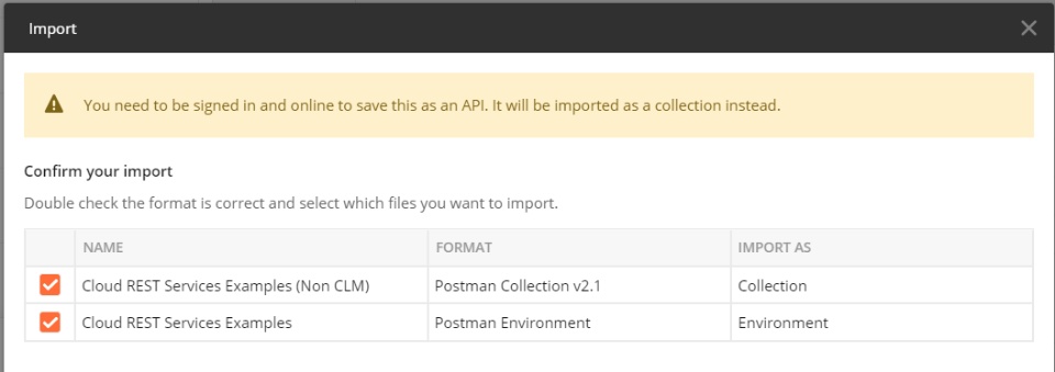 Drag and Drop template file (Cloud REST Services Examples (Non CLM).postman_collection.json) and environment file (Cloud REST Services Examples.postman_environment.json) into dialog