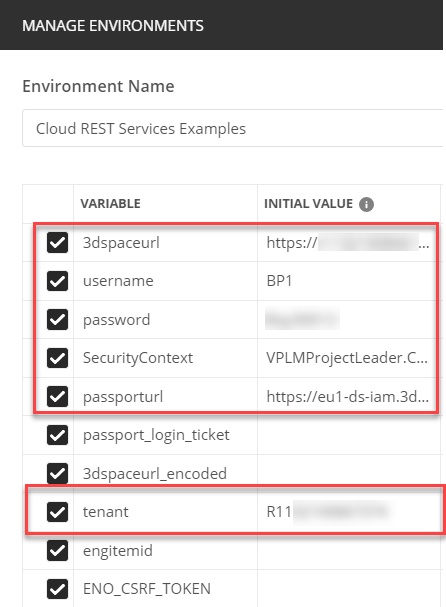Click Import Set environment from pulldown and setup variables used. Only those highlighted are required as the others will be set via the Postman requests programmatically. The tenant is optional and only required if connecting to a cloud environment.
