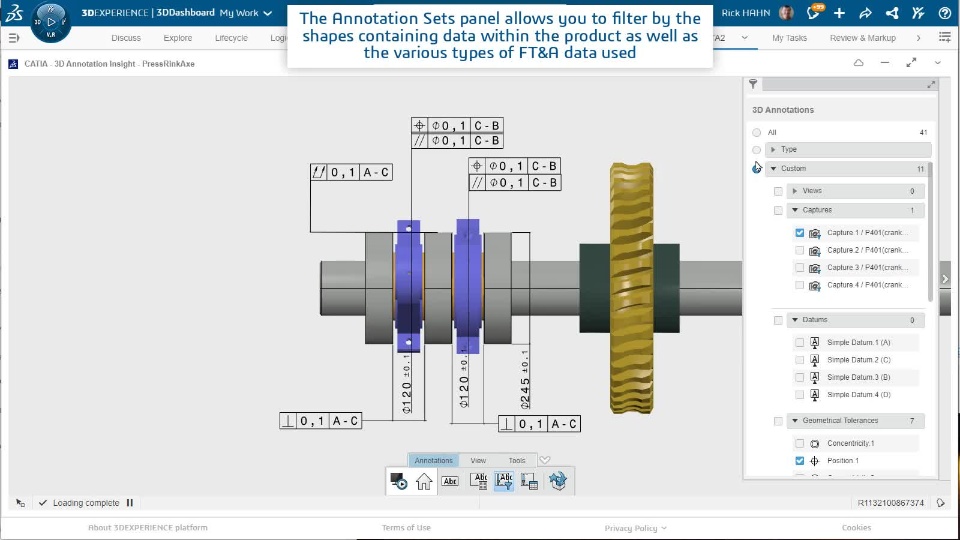 The 3D Annotation Insight app is available with the 3D Product Architect (PAU) role and provides users the ability to easily access tolerances and annotations generated in the 3D Tolerancing & Annotation native app.