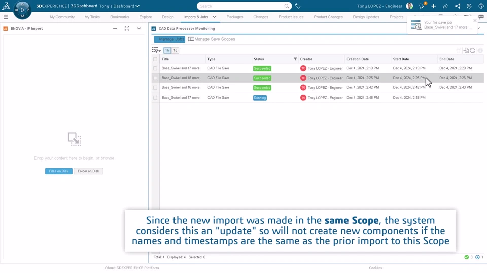 Another important feature of the IP Import application is it’s ability to import the the same data multiple times and not create duplicate data. This is controlled through the concept of “Scope”. Scope represents a context with which product structure data is saved to 3DEXPERIENCE platform. You can create data in a particular Scope where each CAD design is unique. You can continue to update data in the same mode. The same data can be saved as a new copy in another save scope and be updated independently and continuously. This provides a great amount of control of imported data as designs evolve across multiple imports of the same data.