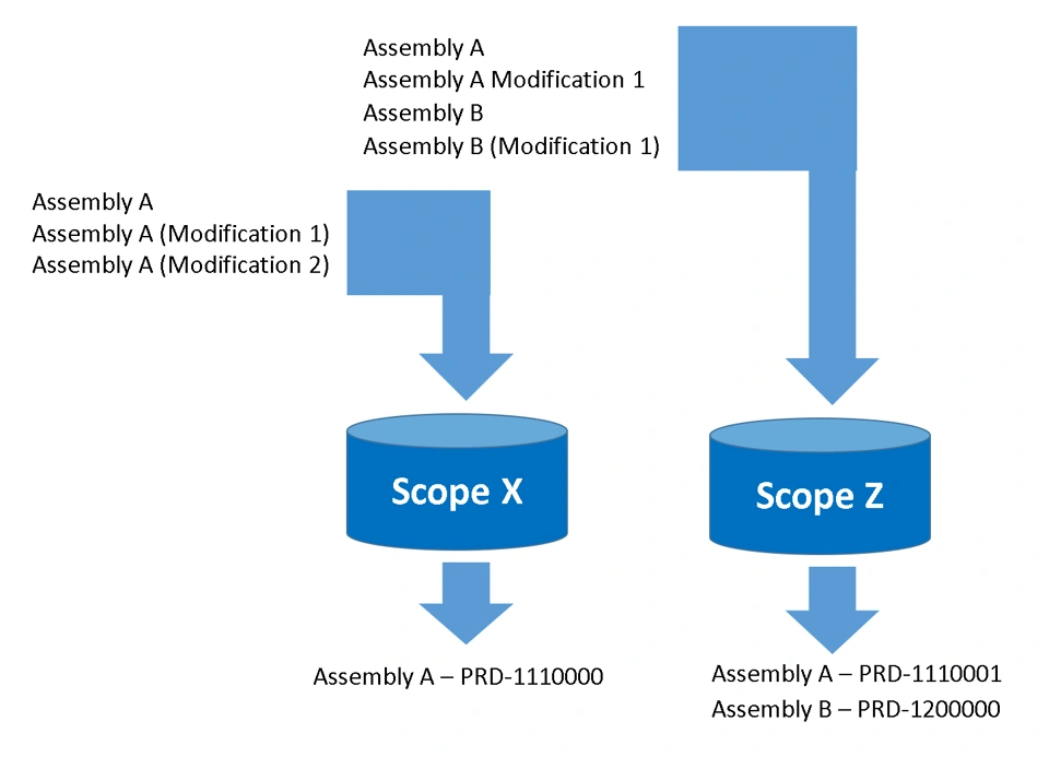 In the example illustrated below, two unique assemblies are imported into the platform in the context of different saved scopes resulting in three unique product structures. This is an important capability when working with imported data that has previously been imported, as such data cannot be overwritten and may require subsequent imports of the same data into a new saved scope.