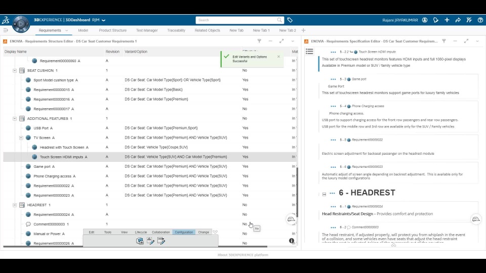 The 3DEXPERIENCE platform enables companies to improve efficiency and effectiveness of the Requirements Engineering process by providing a widgets-based web browser. In addition to providing a centralized repository and connectivity between different objects, the platform enables better implementation of traceability & tracking, managing changes and the allocation of requirements to models or model versions.