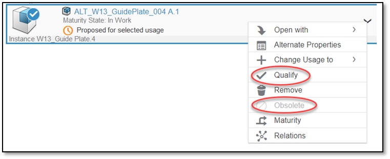 Qualification/ obsolescence of Alternate Items can be completed manually using the menu from the Alternate Item itself: