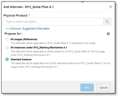 - During the alternate creation, using the “Add Alternate” panel (displayed above), the system can propose a reuse of existing alternates that are already available in a previous revision/branch of the same item, or in the original item, in case the current one is a duplication of it. This is made available through the “Discover Suggested Alternates” option.