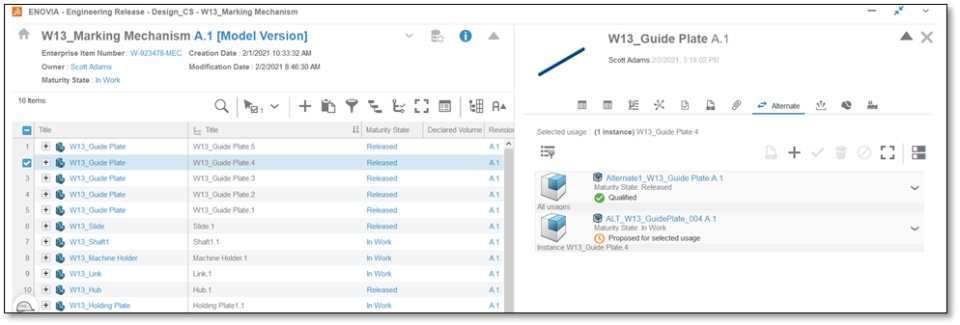 From the Engineering Release Management widget, you can use the “Alternate” tab in the information panel to define all possible alternates of the selected Engineering Item (or Primary Item):