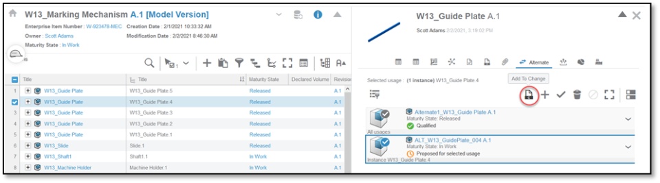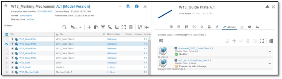 2 | All instances of W13_Guide Plate | This alternate can replace all instances of W13_Guide Plate (only when it is under parent W13_Marketing Mechanism) |