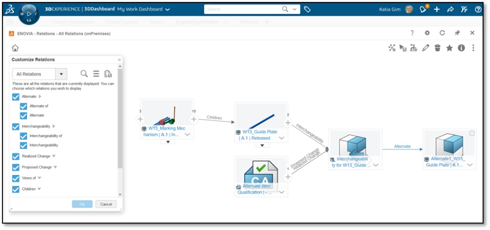 Alternate relations are available in the “Relation” app, which enables navigation on the Alternate Item and its Primary Item (this relation is called “Interchangeability) as well as with other relations (such as Change Actions relations). These relations can be personalized to expose the specific ones relevant to the user.