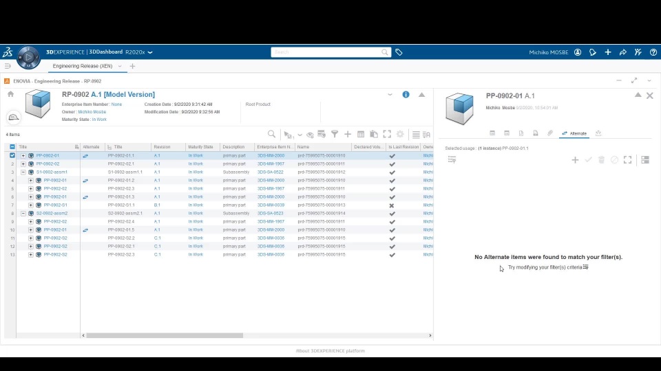 From R2020x FD02 onward, you can use engineering items in the database as alternates to replace engineering items in our engineering definition from the web in the 3DDashboard. This is done using the Engineering Release widget that is included in the Product Release Engineer (XEN) role. Engineering items are assemblies and parts that you build in an authoring tool and can open in Engineering Release. Engineering items also can be objects that you associate with parts and assemblies.