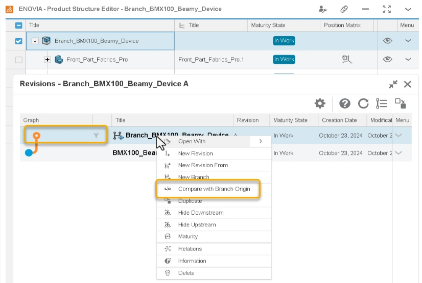 - For these branches, the Compare with Branch Origin command is now available in the context menu, enabling quick and convenient comparison with source (Filtered Product structure).
