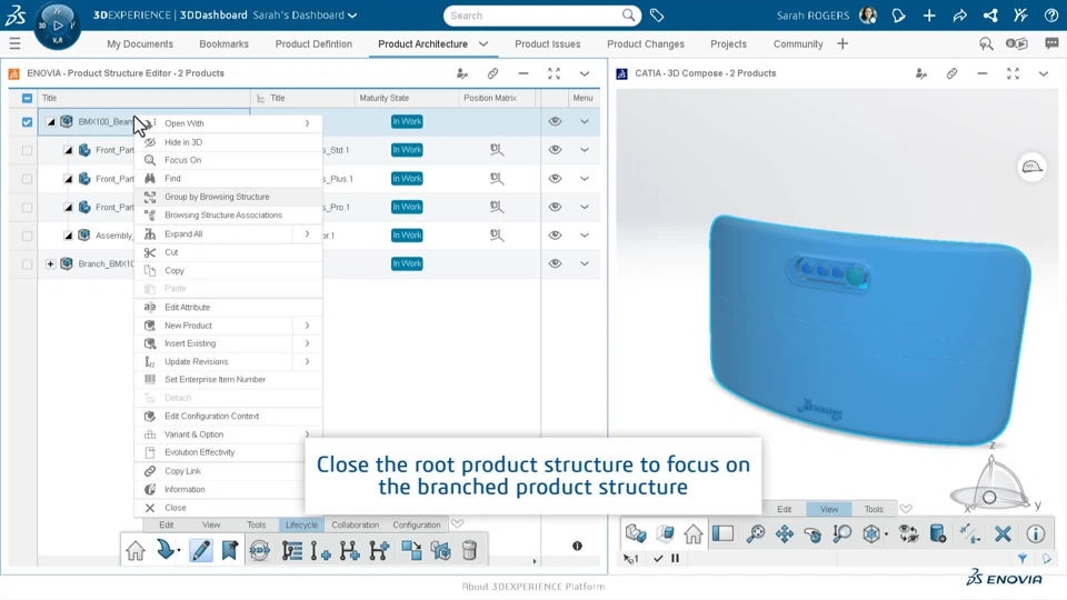 In the 3DEXPERIENCE Platform, branching product structures allows you to perform the isolated design studies to explore alternatives or address flaws in the current design. It also ensures that components in production remain unaffected by these studies or corrections. Once a study is complete, the content of a chosen branch can be merged into a new revision.