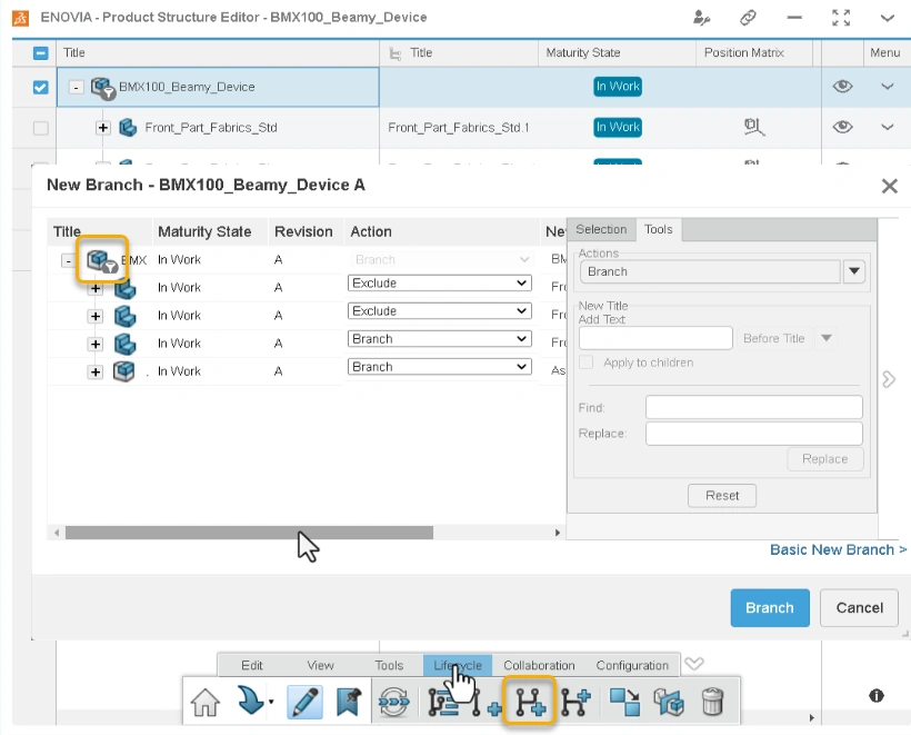 Starting from the R2025x GA release, you can now also create a branch from such filtered product structure to initiate an isolated design study. In the Branch dialog box, you can use the Advance Branch option to Branch/Reuse/Exclude specific products while branching.