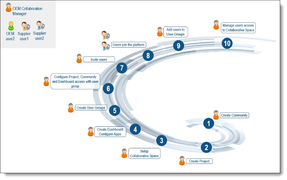 The first use case describes the steps to initiate a new Collaborative Hub. The current release on the public cloud (23xFD03) introduces the support of this use case. In this use case illustrated below, we explore the scenario of an OEM working with a single supplier. The supplier has two stakeholders who will be collaborating with the main stakeholders. A main stakeholder, the OEM Collaboration Manager, creates the various features of the Extended Collaboration noted in the steps. Governance is managed through the dashboard sharing specific applications with the stakeholders.