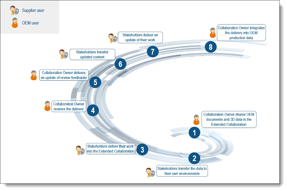 In the second use case illustrated below, the Collaboration owner, a main stakeholder within the OEM governs the document and 3D data provided by both the OEM and the supplier throughout the lifecycle of the collaboration.