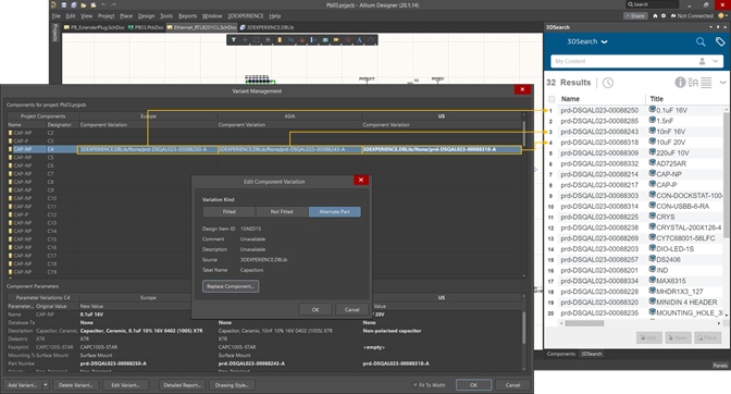Beginning in R2021x FD03, Collaborative Designer for Altium allows users to assign alternate parts that are stored in 3DEXPERIENCE by maintaining a local component database (*.DBLib) that is synchronized with the parts in 3DEXPERIENCE (see an example in the image below). When the user saves the design to 3DEXPERIENCE, the design variants are saved as well. The local component database also allows users to choose 3DEXPERIENCE components while offline regardless if design variants are used.