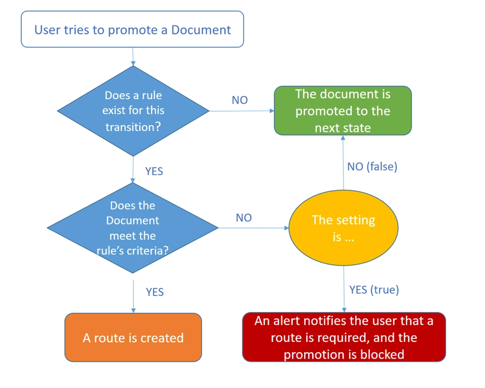 In this case, a route is created only if a rule was configured for the specific maturity transition and the Document met the defined criteria. Otherwise, the Document could be promoted without restrictions.