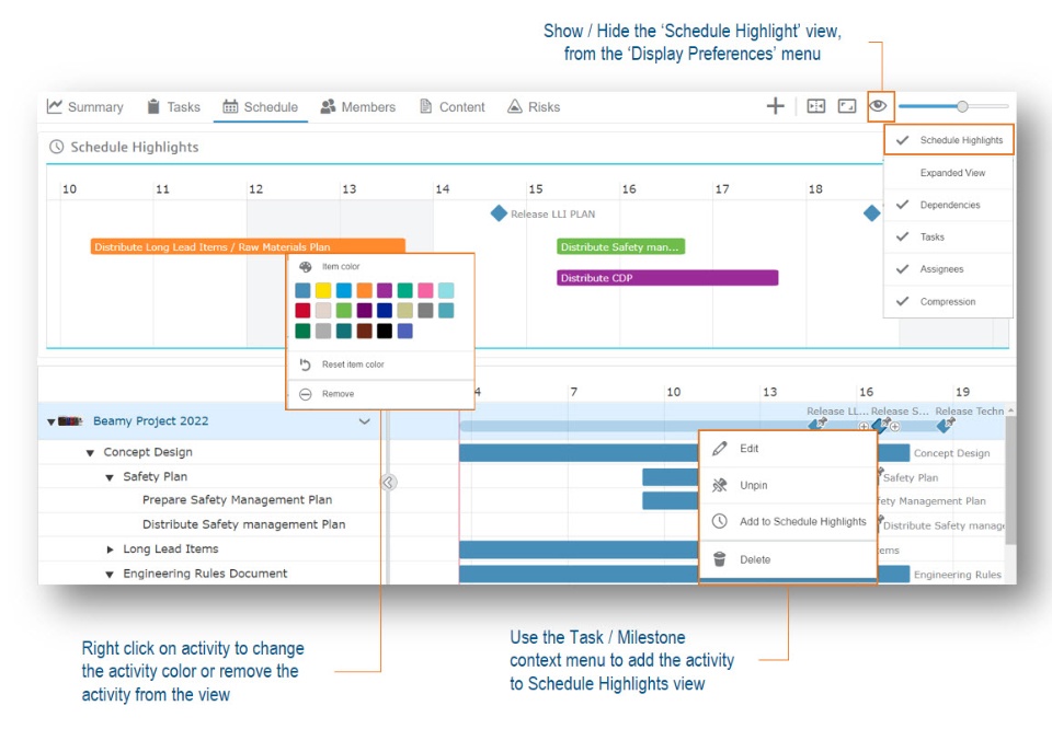 You can add activities to the ‘Schedule Highlights’ using the right mouse menu of the task or milestone. Then you can apply colors to the highlighted tasks and milestones in the ‘Schedule Highlights’.