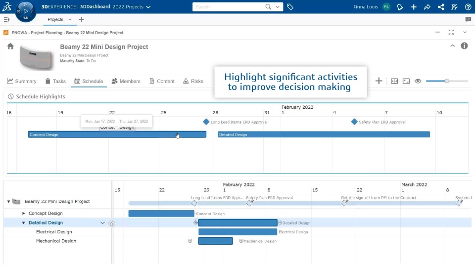 The ‘Schedule Highlights’, allows Project Managers to build a summary view of the project, by adding and highlighting the key Tasks and Milestones which represent best the project schedule.