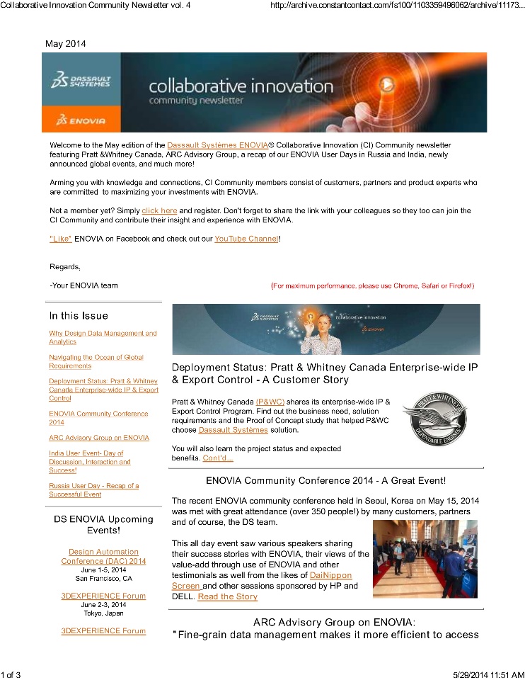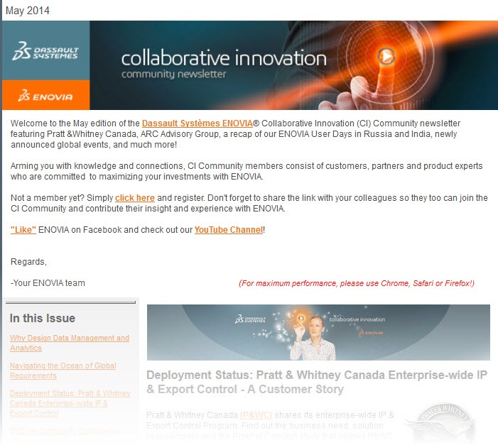 The ENOVIA Collaborative Innovation newsletter for May 2014 has just been published.