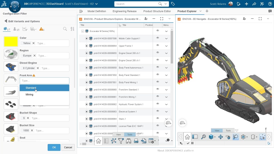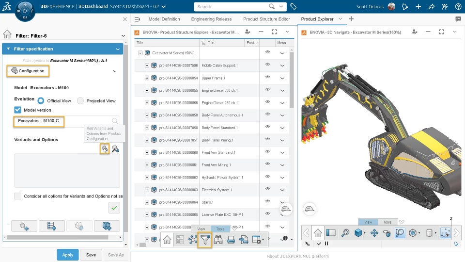 Once effectivity definition is complete, you can filter the configured structure (150% Definition) to obtain resolved structure. You can apply filter based on predefined or on-demand product configuration. These filters can be leveraged by the complete engineering community with various intents including configurations review, simulation, and validation. You can filter configured structures in various apps such as Product Explorer, Product Structure Editor, and Engineering Release etc.