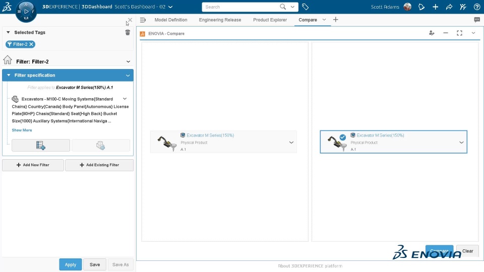 You can use ENOVIA Compare widget to compare filtered configured structures. The comparison returns following results: