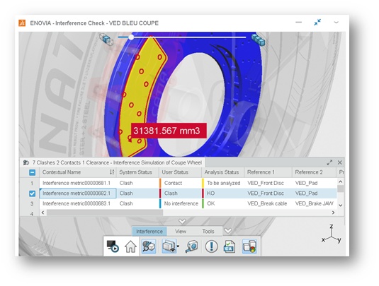The web “Interference Check” app, available in the role, Digital Mockup Review Manager (RED), enables design reviewers (*) to visualize, analyze and collaborate around design issues early in the development process. Users can visually check and assess product clashes, contacts or clearances, share status with other collaborators and raise formal issues or change processes to resolve these interferences.